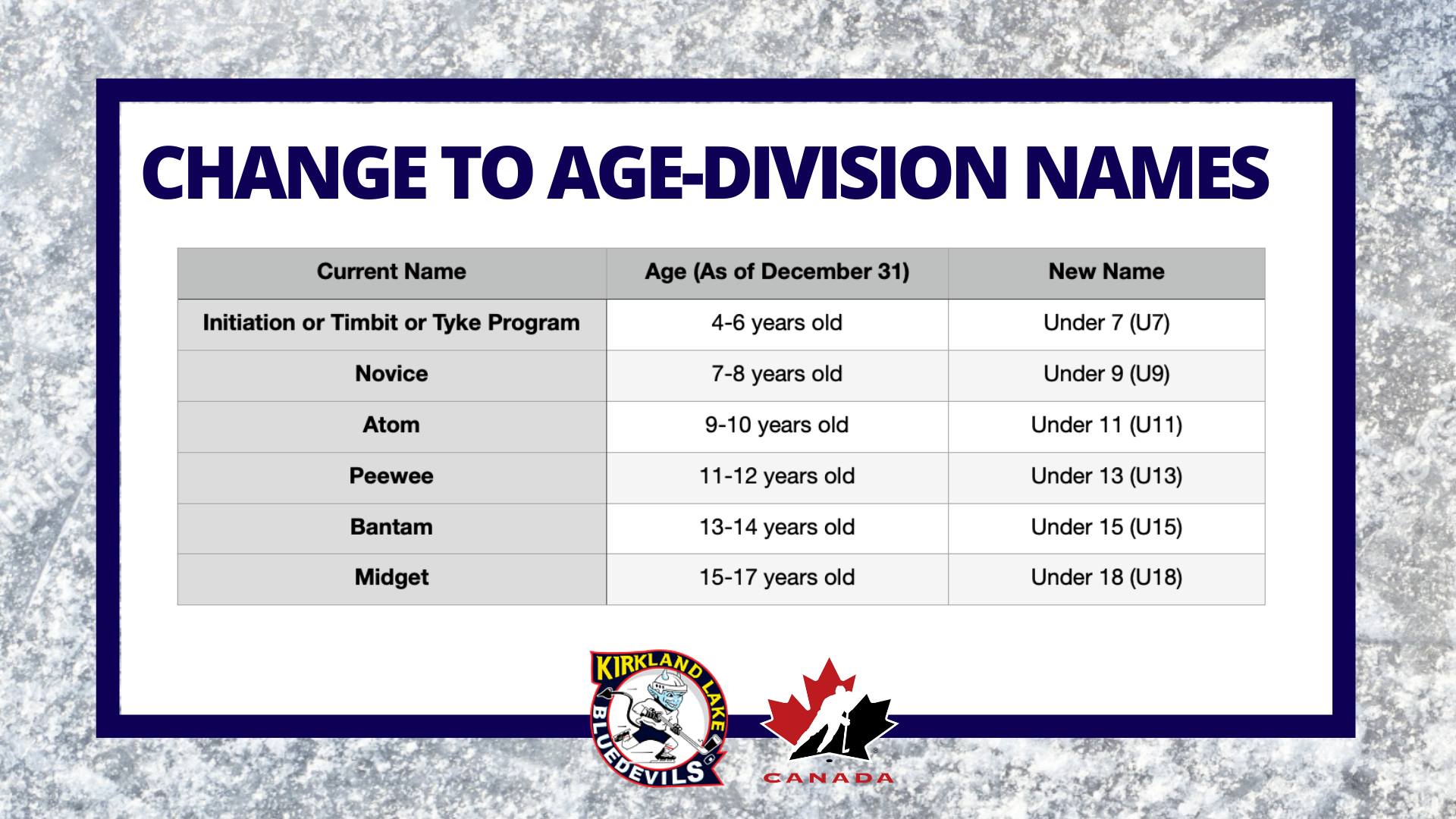 Hockey Canada announced earlier this year that they were changing the Age-Division naming. The changes simplify the minor hockey system and go into effect this season. Click here to read the full details from NOHA. If you are unsure what division your player(s) will be on, drop us an email at klmha@live.ca.